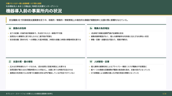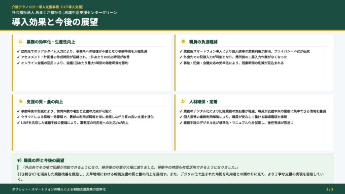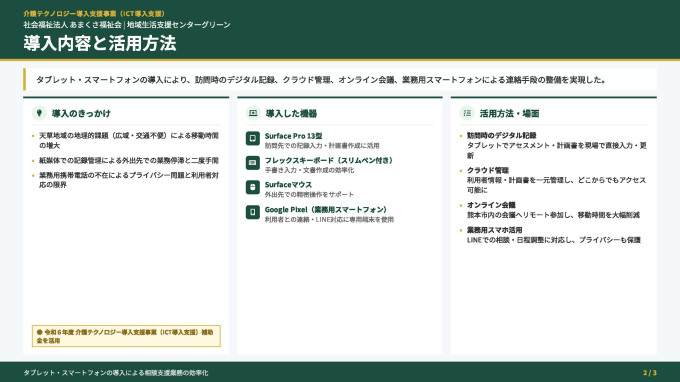 当事業所にて申請しておりました「令和6年度介護テクノロジー導入支援事業(ICT導入支援)」の補助金が交付され、タブレット端末等を導入し、業務のデジタル化を進めることができました。